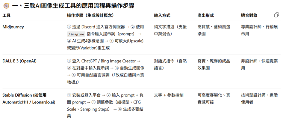 要看目的是甚麼,如果以生成概念圖這個目的來看,這三個生成式 AI 工具(Midjourney、DALL·E、Stable Diffusion)都是目前最常被室內設計師用來生成設計概念圖的工具,但它們在「操作流程」「控制精度」「渲染風格」與「實務應用」上有差異。
