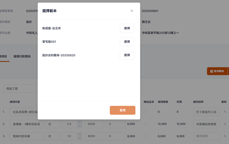 同時也提供範本管理功能,讓工種與材料的報價資訊能根據不同案場來選擇最適合的版本,並且不斷更新與建立新的範本。
