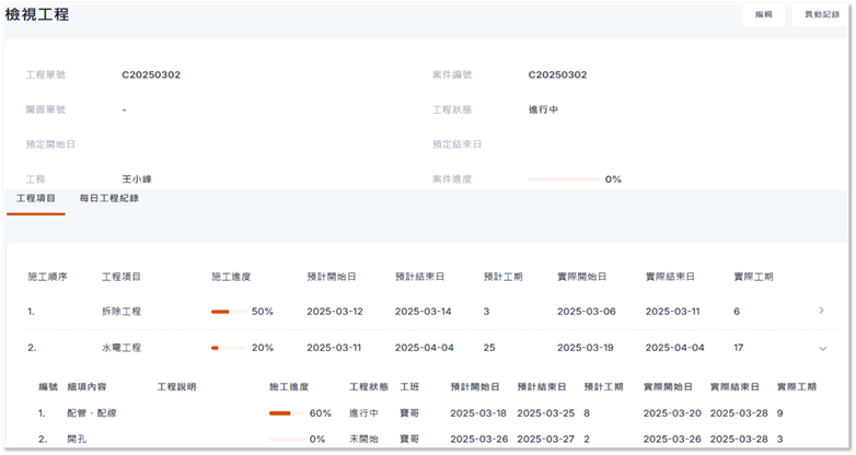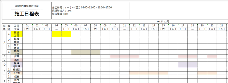 - 工程項目也會進一步生成排班表,讓設計師能根據進場順序、施工日期、案場的規範與業主要求的條件下,進行每周的進場排班表。