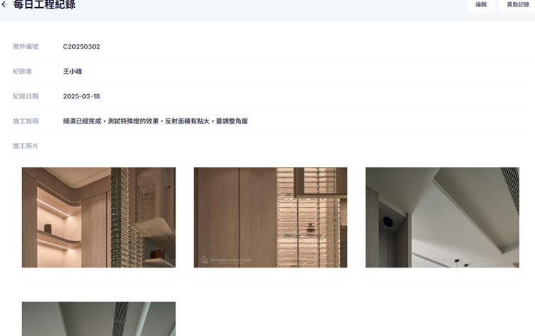 - 包含每天的工作日誌紀錄,把工程進度、現場況狀回報與溝通等重要任務完成在同一個流程中。工務、設計師與業主都可以針對每天的狀況進行完整的溝通,避免工地管理不善、材料凌亂缺損或甚至危險的情況發生。