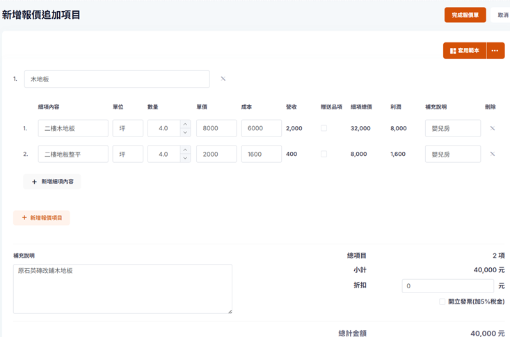 設計師的線上報價介面能完整呈現成本、單價、毛利與各項資訊,當然部分資訊不會呈現在業主面前,例如成本與毛利等,這些資訊有助於設計師做出最適合的報價單,必免傳統用Excel報價上容易出錯的問題發生。