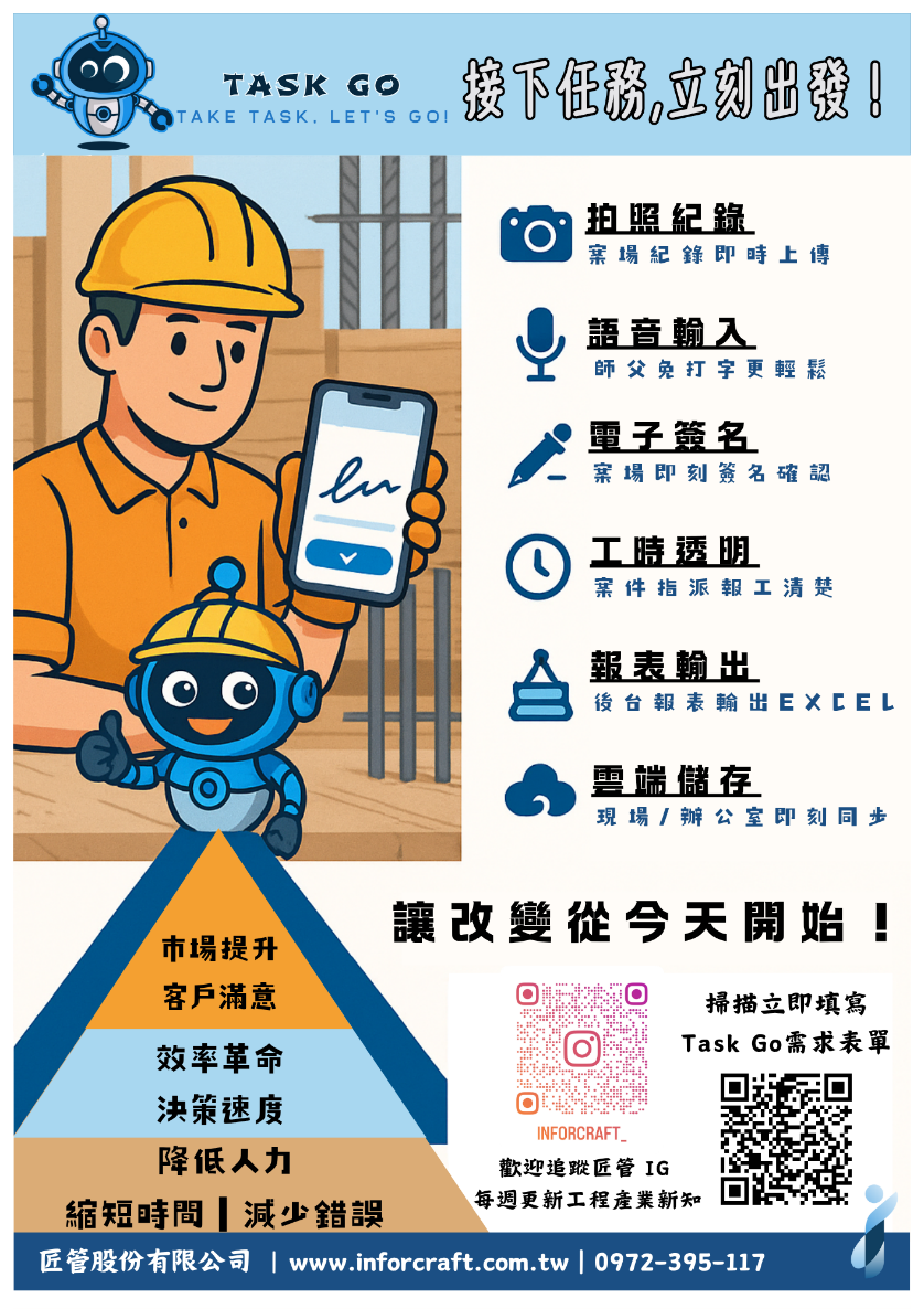 匠管TaskGo與天禧資訊GoBridge於2026年3月正式結盟,結合GoBridge在設計裝修客戶流程流程與TaskGo在施工現場管理的雙重優勢,成立TaskGoBridge品牌 《當設計團隊遇上工程團隊》,給設計裝修產業的全方位平台。